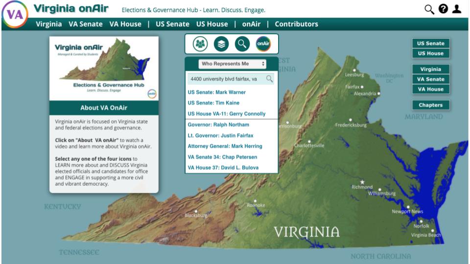 The Virginia onAir Hub is a website where Virginia voters can LEARN about and DISCUSS with their elected officials and candidates for office and ENGAGE in supporting a more civil and vibrant democracy in Virginia. Virginia onAir is focused on elections and governance …. “Governance” being how laws are made and how we as Virginia students and residents … can influence legislation.